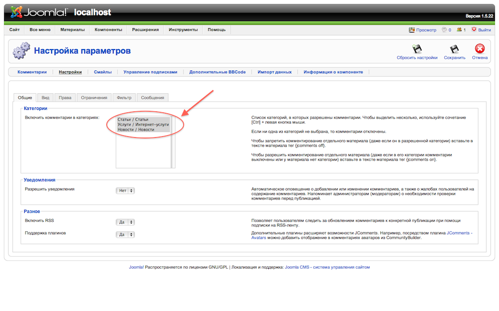 6. Включите JComments в необходимых категориях: Компоненты -> JComments -> Настройки -> Общие.