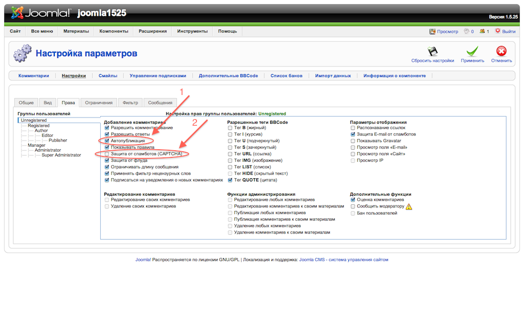 7. В настройках компонента JComments включите автопубликацию комментариев и отключите CAPTCHA: