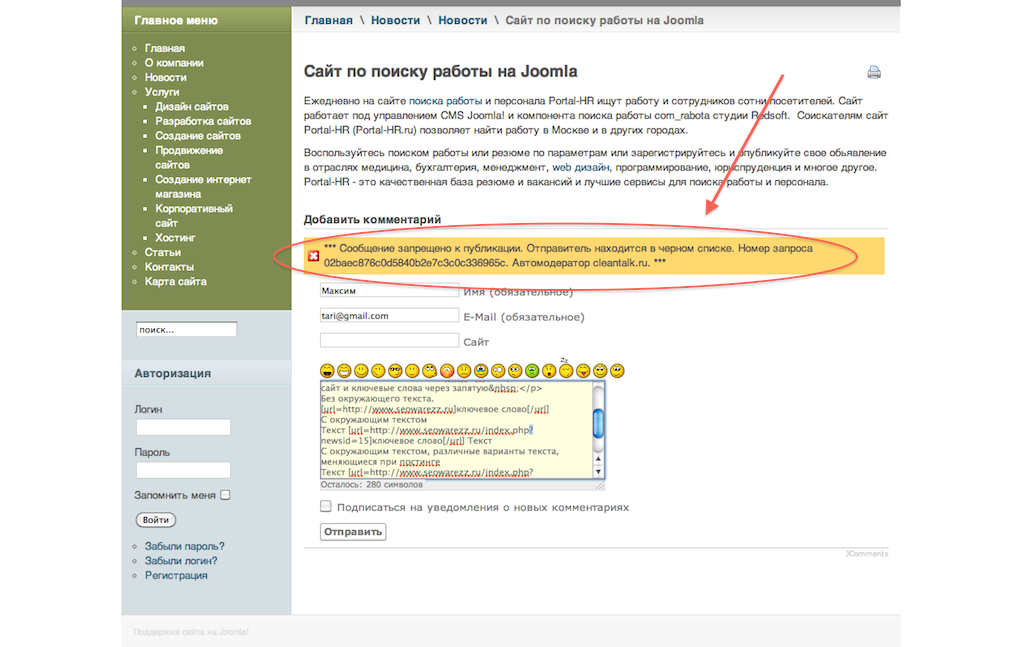 9. Напишите сообщение к любой статье, новости где включен JComments. Для проверки плагина используйте email "stop_email@example.com"