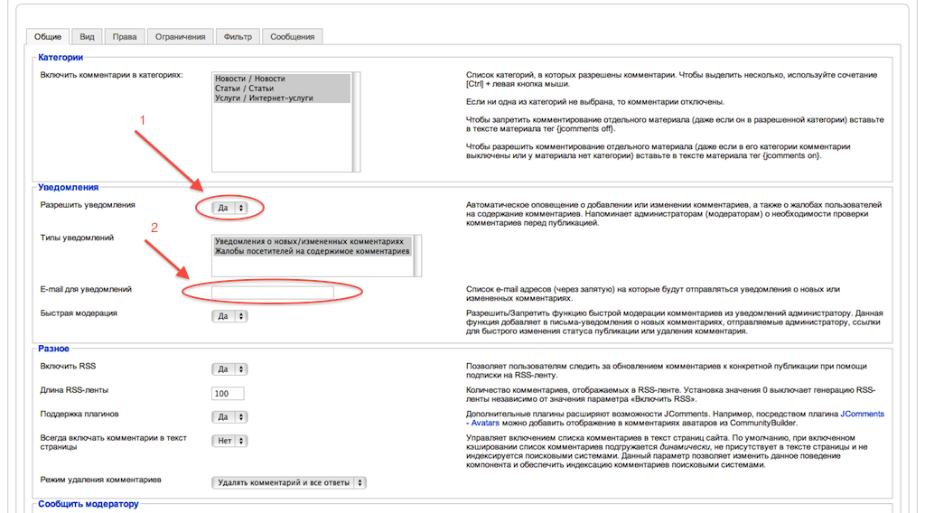 8. Включите уведомления о новых комментариях на сайте: Компоненты -> JComments -> Настройки -> Общие