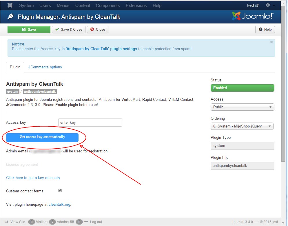 Go to plugin settings: Extensions -> Plugin Manager -> Anti-Spam by CleanTalk. In plugin settings press "Get access key automatically" button. Admin email will be used for registration.