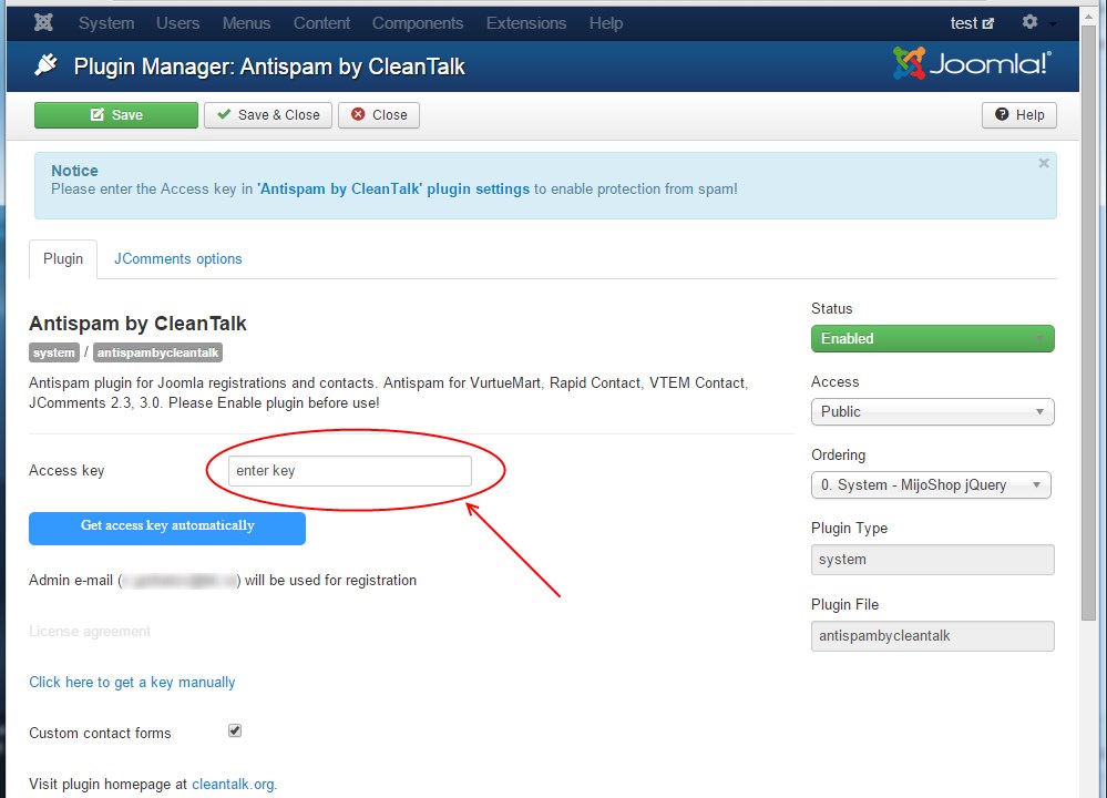 CleanTalk Anti-Spam set up on Joomla 2.5