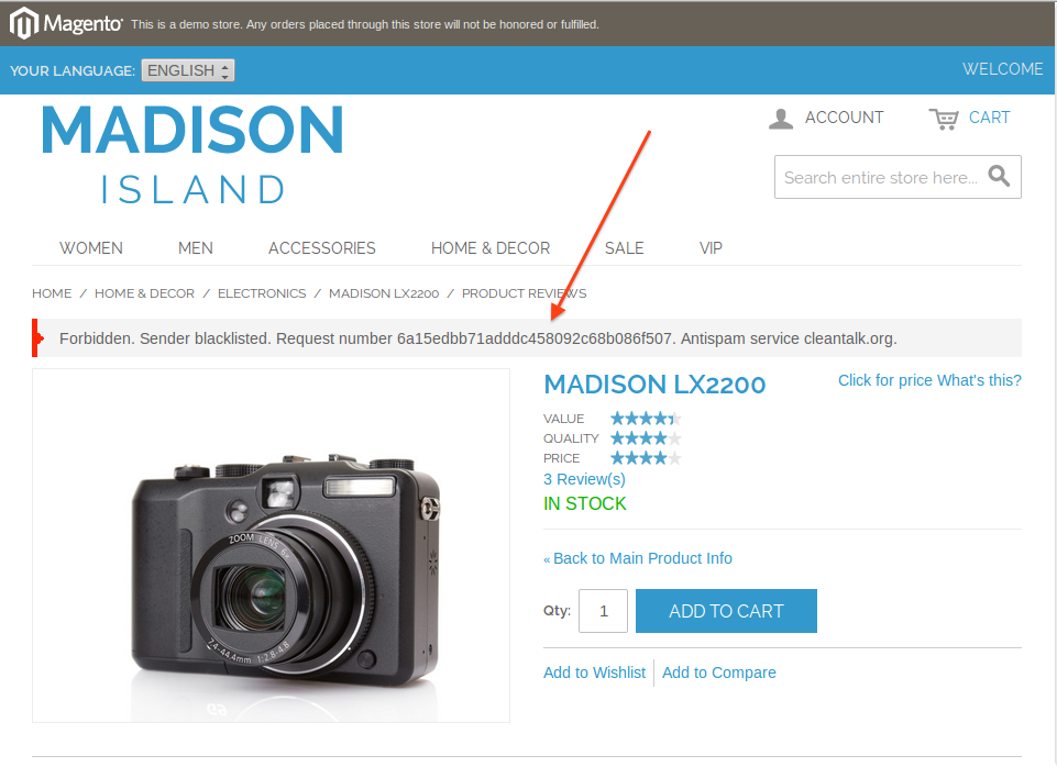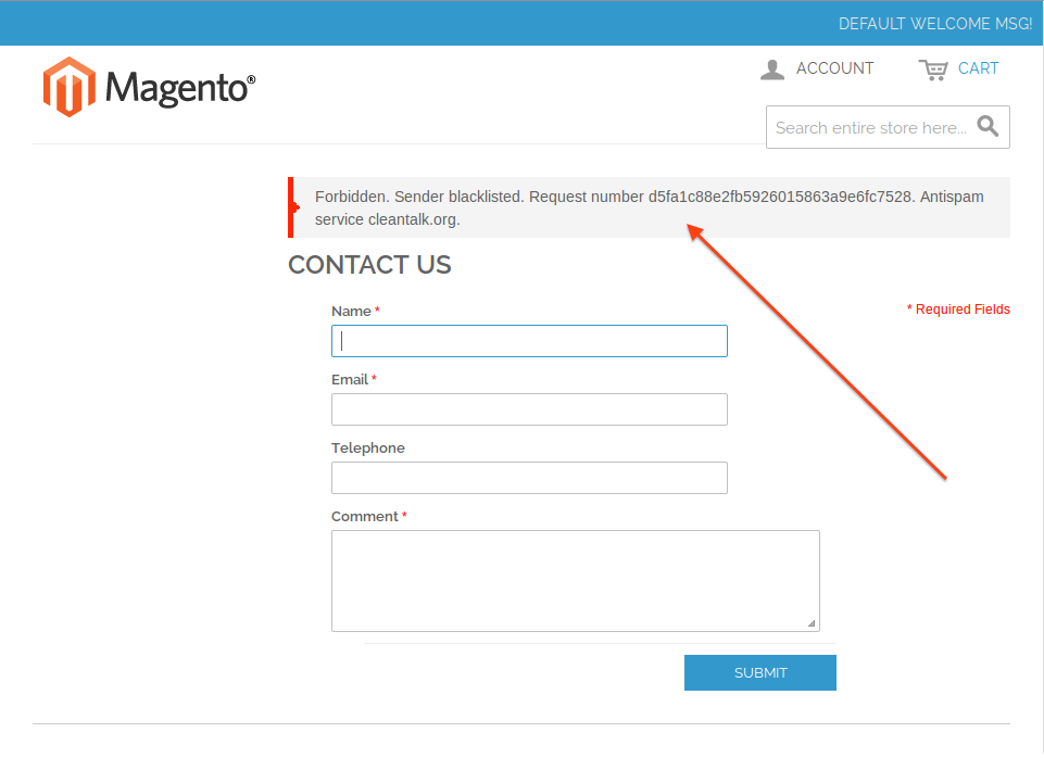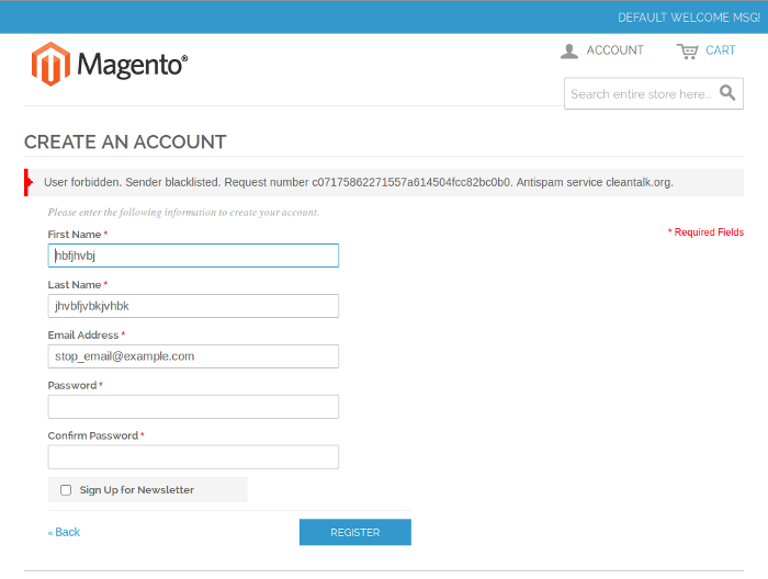- Do the test registration using this e-mail: stop_email@example.com. You should see the message that the spam has been blocked.